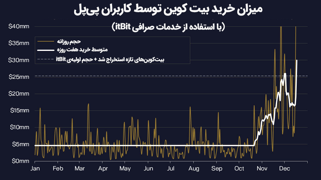 شرکت سرمایهگذاری و نگهداری داراییهای رمزارزی پنترا کپیتال(Pantera Capital) اعلام نموده که اعداد و ارقام تازه منتشر شده حاکی از ان است که کاربران شرکت خدمات پرداخت پیپل(PayPal) در حال حاضر تمامی بیت کوینهای جدید وارد شده به بازار را میخرند.