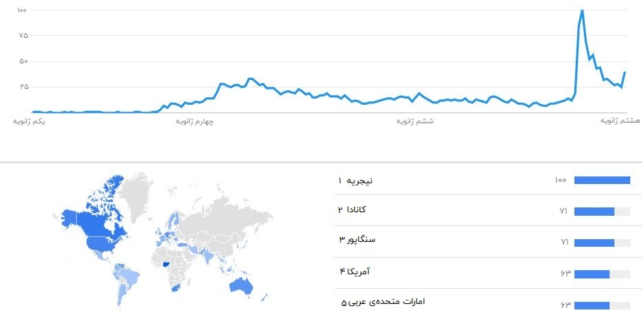 پس از کشور نیجریه، کانادا، سنگاپور و ایالات متحدهی آمریکا بیشترین جستجو برای عبارت «Bitcoin Iran» را ثبت کردهاند.